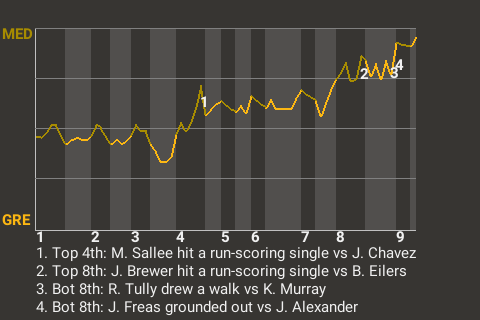 Ballpark: Naturals Grounds Weather: Clear skies (68 degrees), wind blowing in from right at 7 mph Start Time: 1:35 PM ET Time: 3:03 Attendance: 5513 |