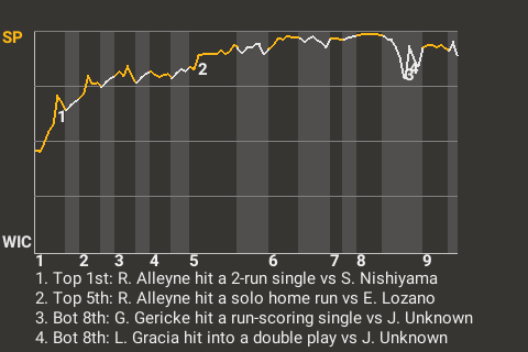 2 (8, 1st Inning off S. Nishiyama, 0 on, 1 out; 6th Inning off E. Lozano, 0 on, 0 outs)