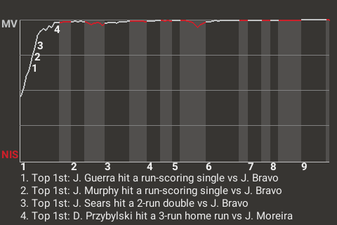 3 (5, 3rd Inning off J. Moreira, 0 on, 0 outs; 6th Inning off T. Couarde, 2 on, 0 outs; 9th Inning off D. Manzano, 1 on, 0 outs)