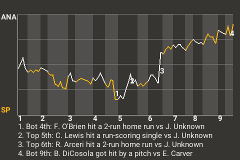 Anaheim used a clutch at-bat from Ronnie Arceri to capture the win. The first baseman hammered a 2-run home run in the top of the sixth inning to put the Music ahead, 4-3. It was his lone hit in 3 at-bats, but it was a humdinger.