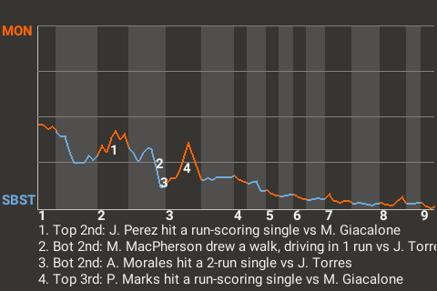 MacPherson had a key at-bat in the bottom of the second to put Santa Barbara in front, 3-1. With the bases loaded, he drew a walk, driving in 1 run off Montgomery pitcher Javier Torres.