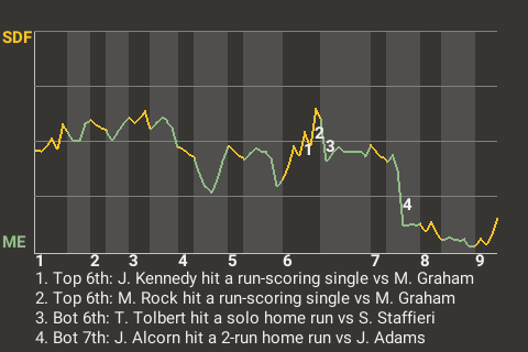 With the game tied, 3-3, in the bottom of the seventh, Alcorn had a key at-bat for Maine. With a runner on 2nd, Alcorn hit a 2-run home run off Jeff Adams, making the score 5-3, Pines.