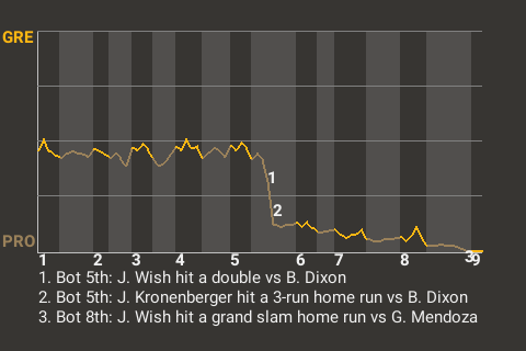 With Providence leading 4-0 in the bottom of the eighth, Wish batted against Greensboro pitcher Gerardo Mendoza. Wish hit a fastball to left-center for a grand slam home run. His 24th home run of the season put the Hex on top, 8-0.