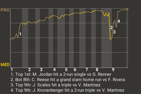Jimmy Kronenberger hit a 2-run triple off Victor Martinez in the top of the ninth, which put the Hex in front, 6-4. In addition to the triple, Kronenberger had 1 single and 1 walk, while going 2 for 3.