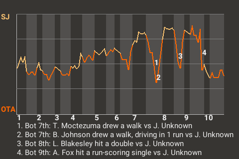 Jon Valdez was ejected in the 6th inning for arguing a strike call.Jim Unknown ties the St. Joseph Mighty Mites regular season game record for walks with 9. Jim Unknown sets the St. Joseph Mighty Mites regular season game record for walks with 10. Tony Moctezuma sets the OTA regular season extra-inning game record for bases on balls with 4.