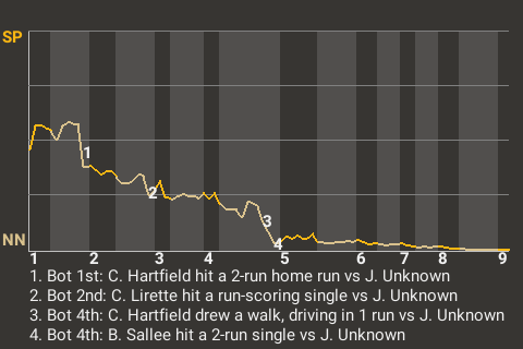 Hartfield contributed a big hit, a 2-run home run, for Newport News in the bottom of the first. With his team trailing 1-0, Hartfield took a changeup from Jim Unknown and stroked the home run to left. His 7th home run of the season allowed the Wranglers to leap in front, 2-1.