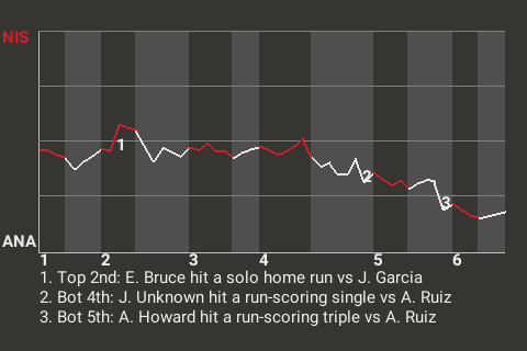 Tied up with the Fighting Knights in the bottom of the fourth inning, the Music got a boost from designated hitter Jim Unknown. With runners on 1st and 3rd, Unknown saw a 2-2 sinker from Alex Ruiz and hit a run-scoring single to break the stalemate and put Anaheim on top, 2-1.
