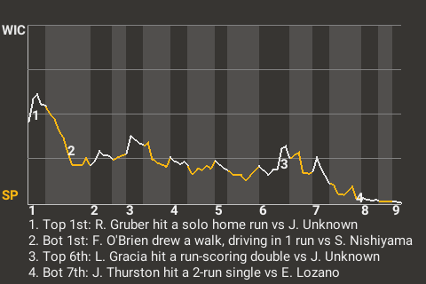 The Spring Park Green Knights overcame a good performance by Wichita left fielder Rick Gruber to knock off Wichita, 8-4, at Ballpark of Spring Park. Gruber slugged 2 home runs. Jim Unknown, the winning pitcher, is now 1-0. He went 7.2 innings, allowing 4 runs on 8 hits, while fanning 4 and walking 2. Spring Park bumps their record to 24-30 with the win.