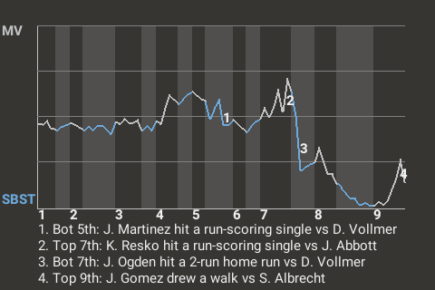 2 (9, 7th Inning off D. Vollmer, 0 on, 0 outs; 8th Inning off J. Eves, 2 on, 1 out)
