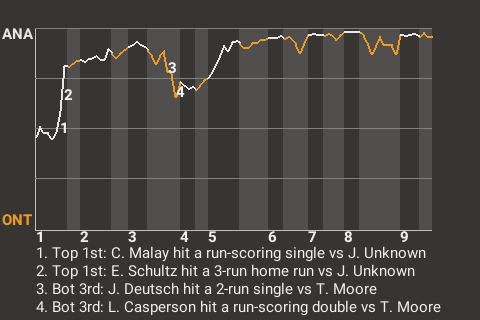 Schultz made an early impact for Anaheim when he stroked his 4th home run of the season. The 3-run home run, which came in the top of the first, put the Music on top, 4-0.