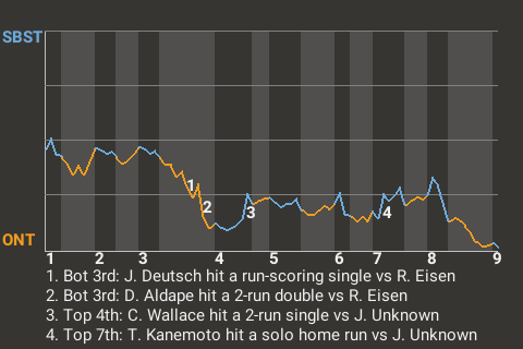 David Aldape had a big 2-run double for the Sunrays in the bottom of the third inning. With Ontario leading 1-0 and the bases loaded, he got a sinker from R.J. Eisen, who is tied for 6th in the SL2 in quality starts with 7, and swatted a double to right. It was his 7th double of the season, and more importantly, it put the Sunrays ahead, 3-0.