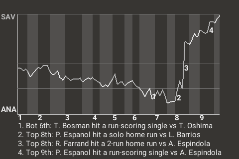 Farrand had a timely hit for Savannah in the top of the eighth. With Savannah trailing 2-1, he turned a first pitch fastball into a 2-run home run. It was his 14th home run of the season, making it 3-2, Savannah.