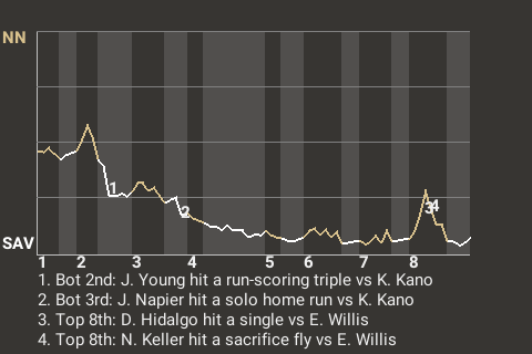 Jim Young hit a run-scoring triple off Kyoshi Kano in the bottom of the second, which put the Alpines in front, 1-0. Young had 1 single, in addition to the triple. For the game, he went 2 for 4.