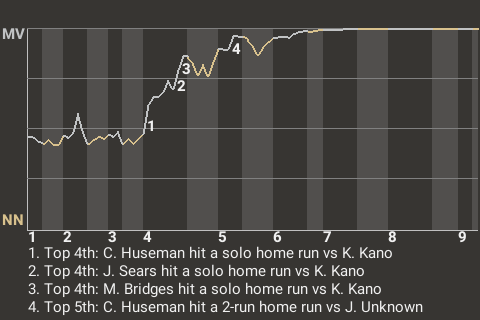 2 (19, 4th Inning off K. Kano, 0 on, 0 outs; 5th Inning off J. Unknown, 1 on, 1 out)